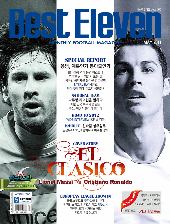 한편, 베스트일레븐 5월호는 현재 한창 진행 중인 스페인 프리메라리가의 양대 산맥 바르셀로나와 레알 마드리드의 라이벌 전인 ‘엘 클라시코’를 커버스토리로 내걸었다. 특히 이번 커버스토리는 ‘엘 클라시코’의 역사, 더비 매치가 배출한 스타플레이어, 작금 세계 최고의 선수로 손꼽히는 바르셀로나와 레알 마드리드의 간판스타인 리오넬 메시, 크리스티아노 호나우도는 물론, 양 팀 사령탑과 키플레이어 등까지 자세히 조명하며 ‘엘 클라시코’에 대한 내용을 알차게 담았다.