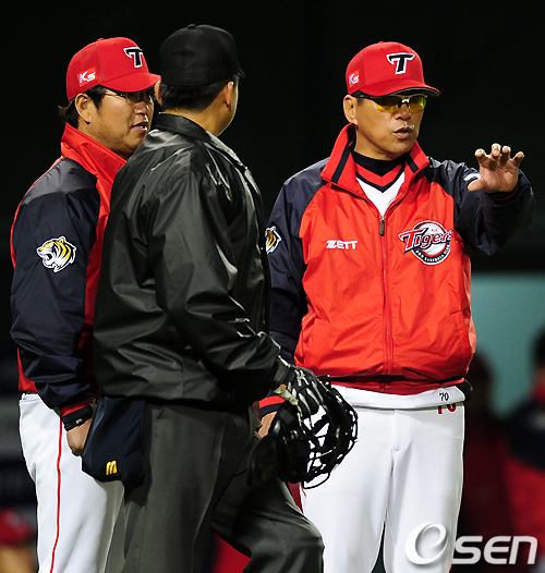22일 오후 서울 잠실구장에서 열린 '2011 롯데카드 프로야구' LG 트윈스와 KIA 타이거즈의 경기, 6회말 무사 1,2루에서 LG 윤상균 타석에 KIA 황병일 코치와 조범현 감독이 그라운드에 나와 박종철 주심에게 불만을 나타내고 있다./ jpnews@osen.co.kr