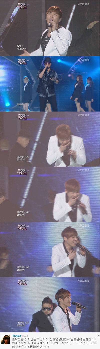 <사진제공> KBS2TV '뮤직뱅크' 화면 캡처(위) 케이윌 트위터(아래)