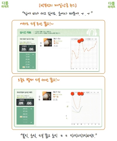 산다라박은 지난 23일 자신의 미투데이를 통해 "속보를 알려드립니다! 춘여사가 벌써 세 번이나 지붕을 뚫은 관계로 지금 숙소에 비가 새고 있다고 합니다!ㅠㅠ" 라며 “하지만 이대로 계속 비를 맞고 싶군요!” 라며 박봄을 축하했다.