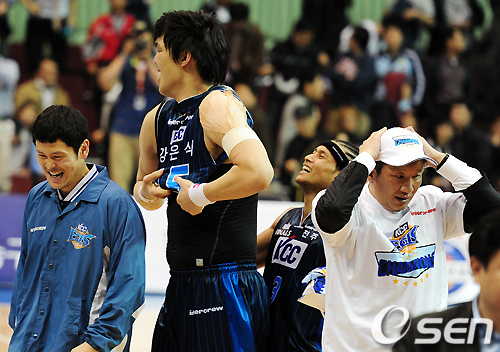 KCC 하승진이 부상으로 시즌 아웃된 강은식의 유니폼을 입고 우승을 기뻐하고 있다./ jpnews@osen.co.kr