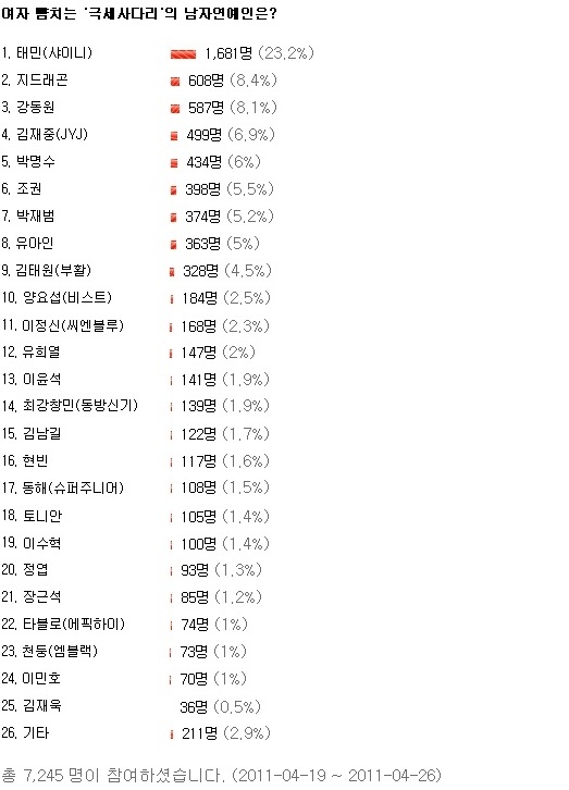 그 결과 그룹 샤이니의 태민이 총 7,245표 중 1,681표(23.2%)의 지지를 얻어 1위를 차지 했다. 태민은 여장을 해도 무방한 가는 다리로, 멤버 중에서도 가장 가느다란 다리를 소유하고 있다.