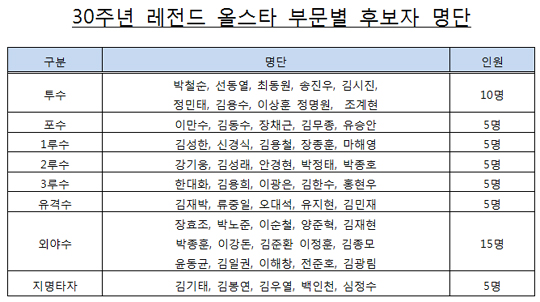각 포지션별 후보는 30주년 기념사업위원회 기념사업분과에서 선정했으며 타자가 포지션별 5명(외야수 15명)씩 45명, 투수 10명 등 총 55명이다.