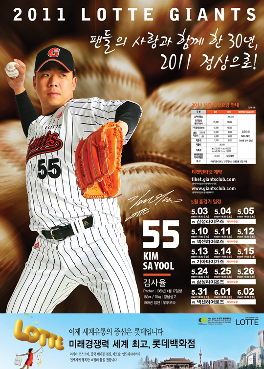 5월 경기일정 포스터 모델은 투수 김사율로 선정됐으며 개인 프로필과 함께 홈경기 일정, 입장요금 안내 등이 실려 있다.