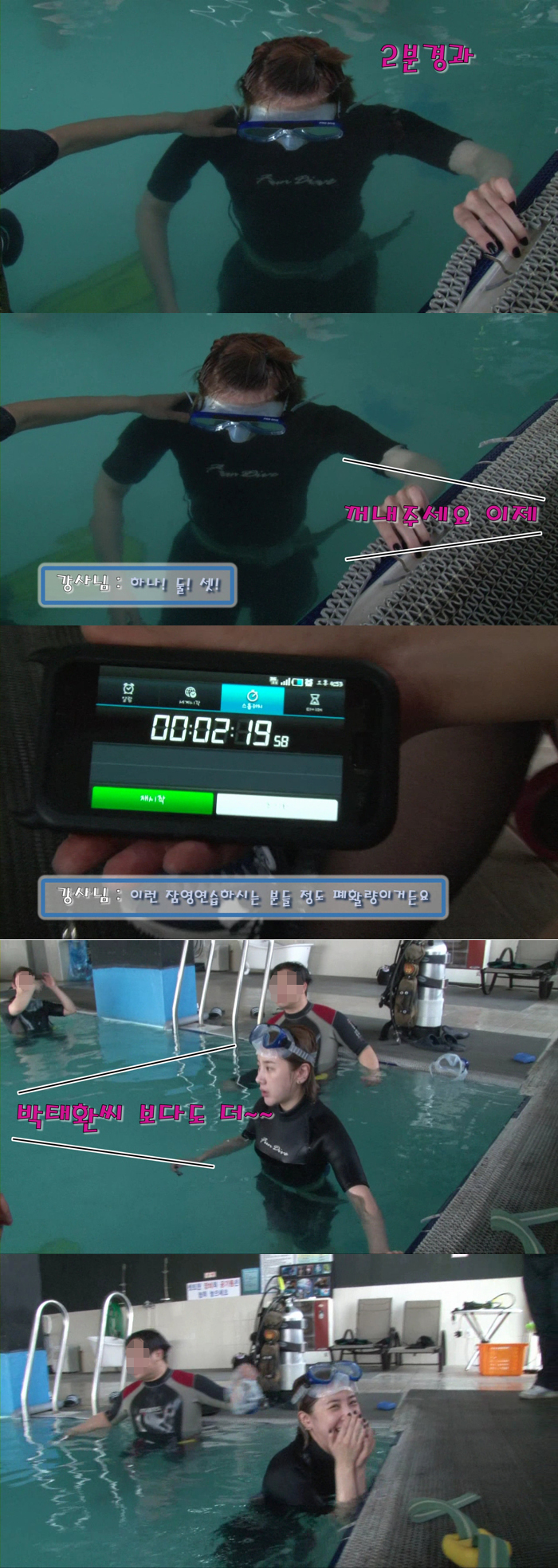 서인영은 영상에서 일반인의 평균 잠수 시간인 1분을 가볍게 넘어 2분 19초의 기록을 세웠다.