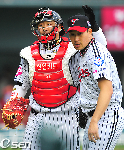 1일 오후 서울 잠실구장에서 열린 '2011 롯데카드 프로야구' LG 트윈스와 넥센 히어로즈의 경기 2회초 2사 만루 넥센 강정호 타석때 올시즌 첫 등판한 LG 봉중근 투수가 삼진아웃 처리시킨 후 조인성 포수와 더그아웃으로 들어오고 있다. / soul1014@osen.co.kr