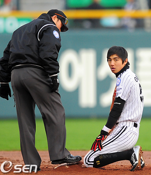 1일 오후 서울 잠실구장에서 열린 '2011 롯데카드 프로야구' LG 트윈스와 넥센 히어로즈의 경기 2회말 2사 1루 LG 이진영의 타석때 1루 주자 이대형이 도루 시도해 넥센 강정호 유격수에게 태그아웃됐다. 이대형이 아쉬운 표정으로 자리에서 일어나지 못하고 있다. / soul1014@osen.co.kr