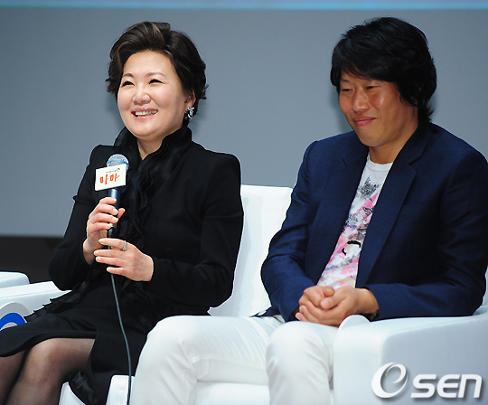 김해숙이 기자회견중 유해진에 대해 말을 하며 환하게 웃고 있다. /rumi@osen.co.kr