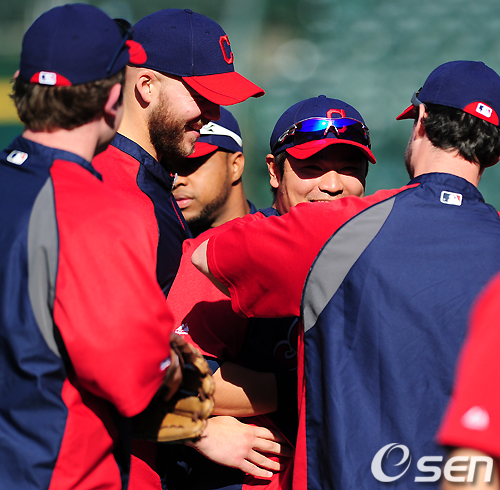 4일 오전(한국시간) 미국 캘리포니아주 오클랜드 콜로세움에서 열린 미국프로야구리그(MLB) 오클랜드 애슬레틱스와 클리블랜드 인디언스의 경기에 앞서 음주운전으로 경찰에 체포됐다 풀려난 클리블랜드 추신수가 동료선수들의 위로를 받으며 미소짓고 있다./ jpnews@osen.co.kr