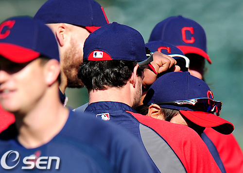 4일 오전(한국시간) 미국 캘리포니아주 오클랜드 콜로세움에서 열린 미국프로야구리그(MLB) 오클랜드 애슬레틱스와 클리블랜드 인디언스의 경기에 앞서 음주운전으로 경찰에 체포됐다 풀려난 클리블랜드 추신수가 동료선수들의 위로를 받으며 미소짓고 있다./ jpnews@osen.co.kr