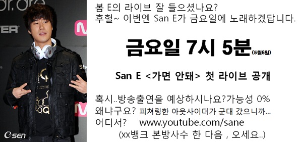 인터넷 상에 공개된 산이의 라이브 공연 안내는 "봄 E의 라이브 잘 들으셨나요? 후헐~ 이번엔 San E가 금요일에 노래하겠답니다. 금요일 7시 5분(5월 6일) San E '가면 안돼' 첫 라이브 공개 혹시..방송출연을 예상하시나요? 가능성 0% 왜냐구요? 피쳐링한 아웃사이더가 군대 갔으니까… 어디서? www.youtube.com/sane (XX뱅크 본방사후 한 다음, 오세요..)"이라는 공지를 올렸다.