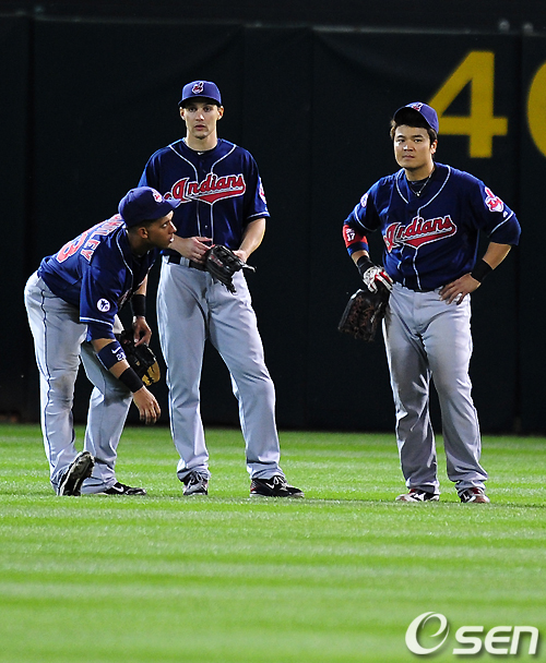 8회말 클리블랜드가 투수 교체를 하자 추신수를 비롯한 외야수가 한데 모여 이야기를 나누고 있다. / jpnews@osen.co.kr