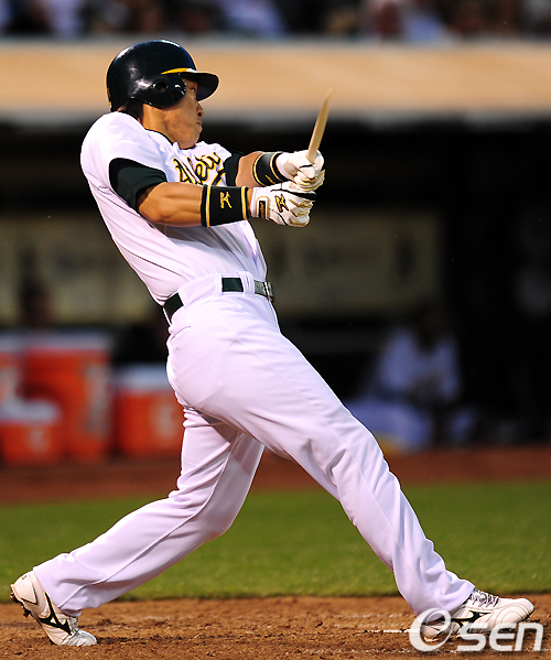 오클랜드 마쓰이가 내야땅볼을 날리며 배트가 부러지고 있다. / jpnews@osen.co.kr