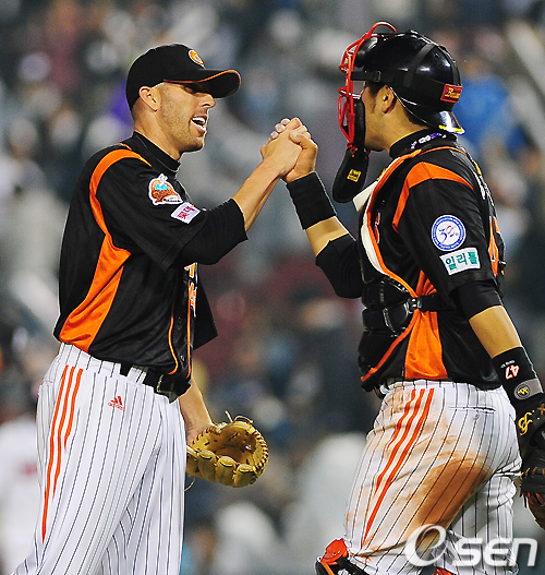 경기를 마치고 롯데 코리와 강민호가 하이파이브를 하고 있다./ rumi@osen.co.kr