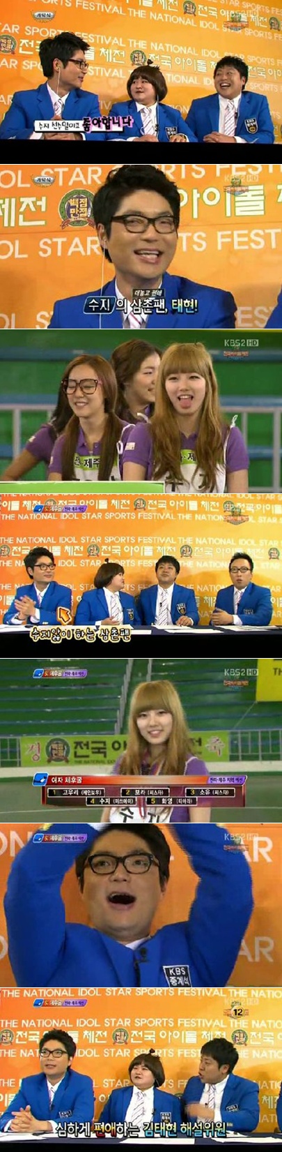 7일 방송된 KBS 2TV '백점만점-전국 아이돌 체전'에 캐스터로 출연한 김태현은 수지의 등장에 긴장한 모습을 감추지 못했다.