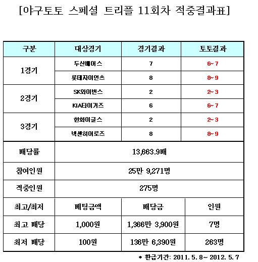 [야구토토] 2011시즌 프로야구를 대상으로 발행 되는 야구토토 스페셜 11회차 게임(트리플) 에서 게임에서 총 275명의 적중자가 나왔다.