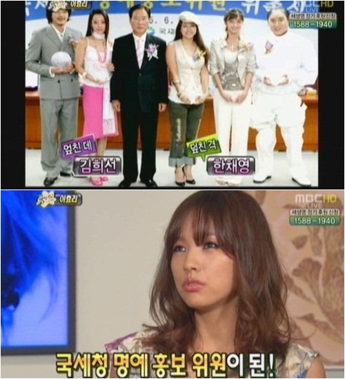 이효리는 "한 때 살이 찌고 굉장히 부었을 때가 있는데 그 때 국세청 명예 홍보위원으로 선정돼 김희선 씨와 나란히 사진을 찍어야 했다"라며 "당시 사진을 보고 나도 깜짝 놀랐다. 정말 그 정도일 줄 몰랐다"고 말해 웃음을 자아냈다.