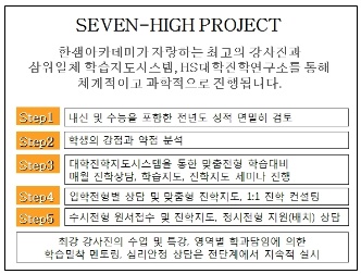 세븐하이(Seven-High) 프로젝트는 서울대, 연세대, 고려대, 서강대, 포항공대, 카이스트 등 최상위권 대학진학을 위한 교육시스템으로, 부설 HS대학진학연구소 및 협력기관인 유웨이중앙교육과의 체계적인 협력을 운영된다. 지난 해 이 시스템을 통해 영역별 평균 3~5등급대였던 수강생 다수가 상위 7개대학에 진학해 학부모들의 좋은 평가를 받고 있다는 설명이다.