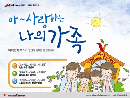 먼저 ‘고마워요, 사랑하는 나의 가족’ 이벤트는 사랑하는 나의 가족에게 고마운 마음을 전하는 칭찬 댓글 이벤트다. 비타민하우스 홈페이지(www.vitaminhouse.net)에 재치 있고 감동적인 글을 올리면 추첨을 통해 비타민을 선물로 증정한다. 또 비타민하우스 공식 카페(http://cafe.naver.com/vitaminpower)에서는 ‘행복해요, 사랑하는 나의 가족’이라는 주제로 가족을 직접 소개하는 이벤트를 연다.