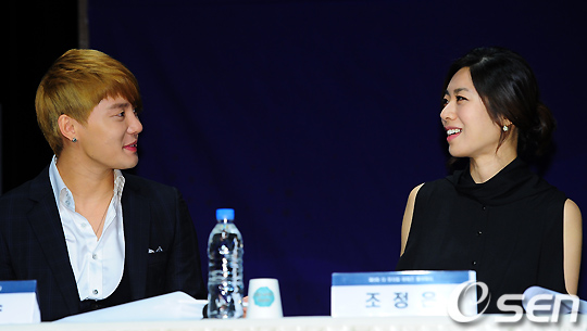 김준수와 조정은이 기자회견중 얘기를 나누고 있다./ rumi@osen.co.kr