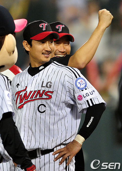 경기 종료 후 LG 박용택과 봉중근이 환하게 웃고 있다. /sunday@osen.co.kr