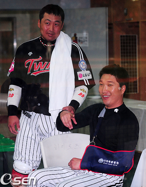 4회초 첫타석에서 LG 이진영이 강병식의 타구를 잡으려 펜스 위로 높이 뛰어 올라 홈런성 타구를 건져냈지만 딱딱한 펜스와 부딪쳐 쓰러졌다.