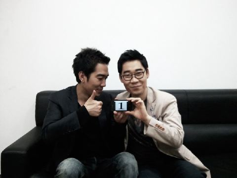 사진 속에 고영욱은 엄지손가락을 치켜세우고 있고, 김연우는 '1(위)'이라고 쓰인 휴대폰을 들고 뿌듯한 미소를 짓고 있다.