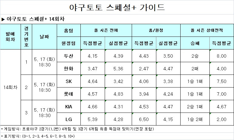 이번 야구토토 스페셜+ 14회차 게임은 17일 오후 6시 20분에 발매가 마감된다.