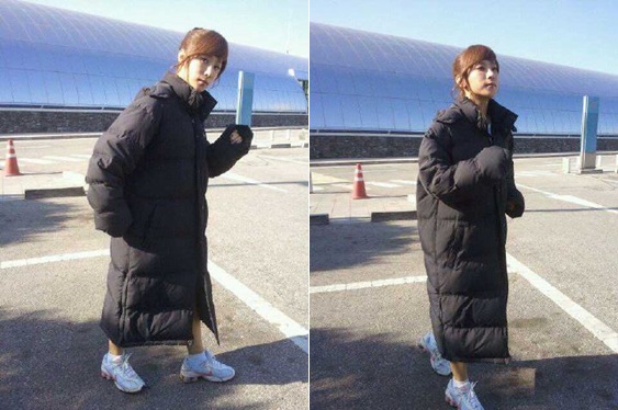 사진 속에 조하랑은 발목까지 내려오는 긴 파카에 운동화를 신고 포즈를 취하고 있다.