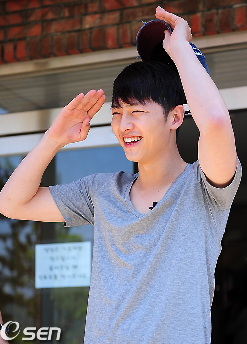 임주환의 입대를 배웅나온 배우 송중기가 모자를 벗고 미소지으며 경례하고 있다./ rumi@osen.co.kr