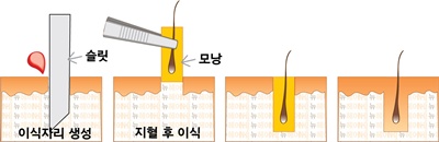 - 슬릿(SLIT) 방식은 모낭이 이식되는 높낮이 조절을 세밀하게 할 수 있어 이식부위 흉터가 생기지 않는다.