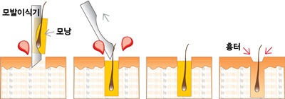 모발이식기(식모기)방식은 위 그림과 같이 이식된 모낭이 두피 표면보다 깊이 들어가게 되고, 주변의 피부는 자연히 움푹 파인 곳을 메우며 아물게 되므로 흉터가 발생 할 수 밖에 없는 것이다.