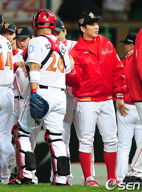 경기후 최연소 최소경기 100홀드를 달성한 SK 정우람이 박경완과 하이파이브를 하고 있다. / jpnews@osen.co.kr