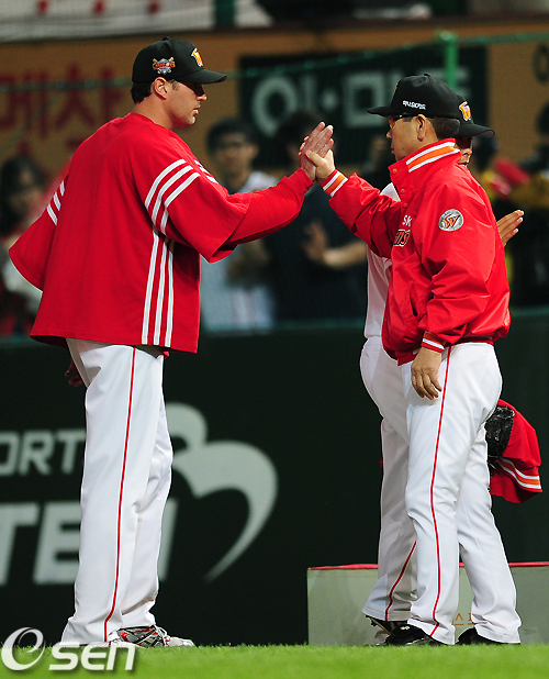 경기후 승리투수 SK 글로버와 김성근 감독이 하이파이브를 하고 있다. / jpnews@osen.co.kr