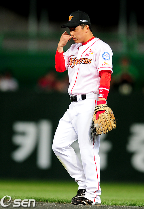 19일 오후 인천 문학야구장에서 열린 '2011 롯데카드 프로야구' SK 와이번스와 롯데 자이언츠의 경기, 6회초 1사 1루에서 SK 정근우가 인필드플라이가 선언되지 않은 상태에서 롯데 이대호의 플라이 타구를 놓치고 묘한 표정을 짓고 있다. 1루주자 손아섭은 2루에서 아웃. / jpnews@osen.co.kr