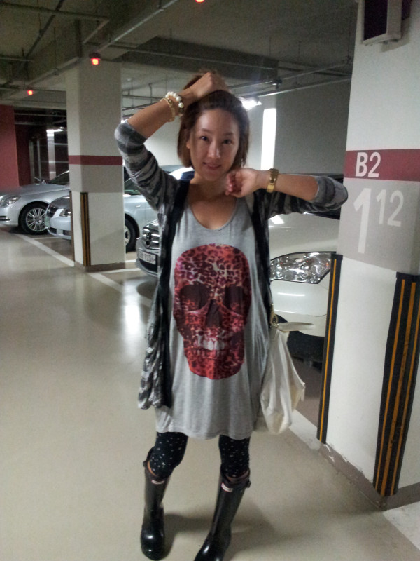 사진 속 김지혜는 해골이 그려진 티셔츠를 입고 레인부츠를 신고 포즈를 취하고 있다.