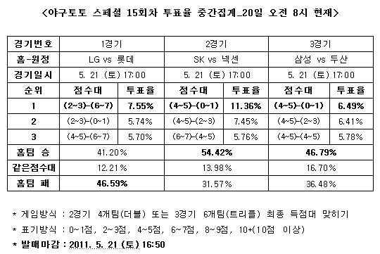 2011 프로야구 3경기 대상 야구토토 스페셜 15회차 투표율 중간집계