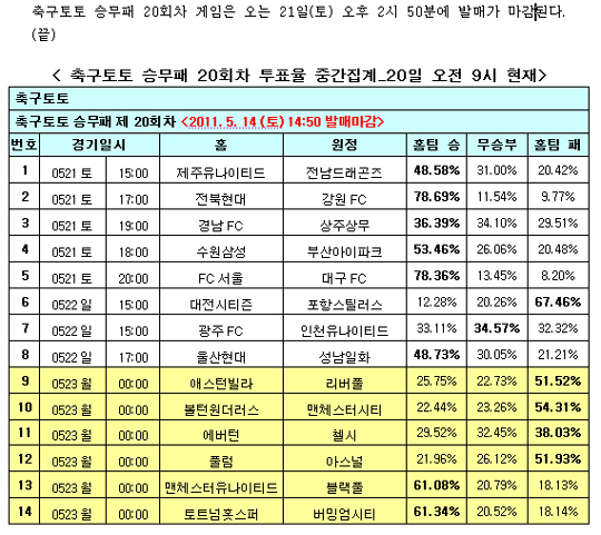 축구토토 승무패 20회차 투표율 중간집계 결과