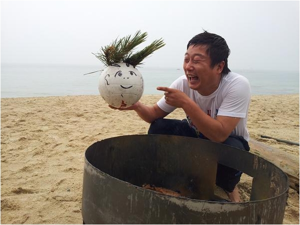 사진 속에 이수근은 옷이 다 젖은 채 백사장에 쪼그려 앉아 있다. 특히 사람 얼굴이 그려진 배구공을 손에 들고 우스꽝스러운 포즈를 취하고 있는 것이 웃음을 자아냈다.