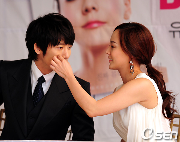 '겟잇뷰티' 출간 기념회를 마친 후 유진과 기태영이 결혼과 관련된 기자회견을 열어 공식 결혼을 발표했다. 유진이 기태영의 얼굴에 묻은 먼지를 뛰어 내고 있다. /spjj@osen.co.kr