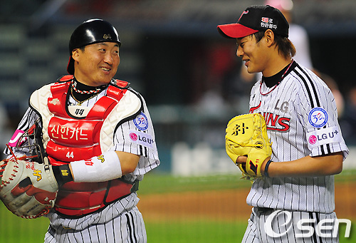 24일 오후 서울 잠실구장에서 열린 '2011 롯데카드 프로야구' LG 트윈스와 두산 베어스의 경기 4회초 2사 2루에서 두산 이원석을 외야플라이로 위기를 넘긴 LG 박현준 선발투수와 조인성 포수가 웃으며 더그아웃으로 들어오고 있다. / soul1014@osen.co.kr