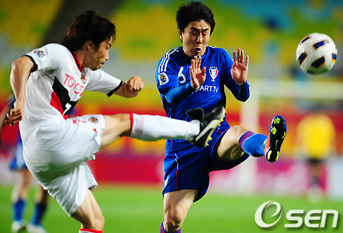 후반 나고야 나카무라가 수원 이용래에 앞서 볼을 걷어내고 있다./ jpnews@osen.co.kr
