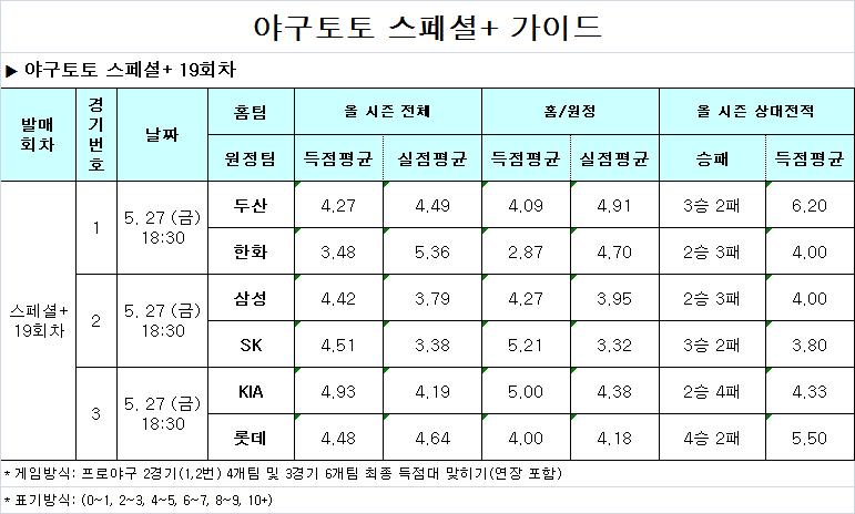 이번 야구토토 스페셜+ 19회차 게임은 27일 오후 6시 20분에 발매가 마감된다.