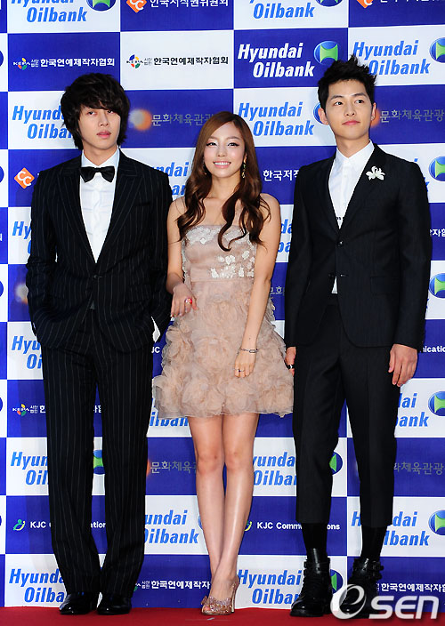 28일 오후 서울 상암동 서울월드컵경기장에서 열린 '드림콘서트'에 참석한 희철, 구하라, 송중기가 레드카펫을 밟고 있다.