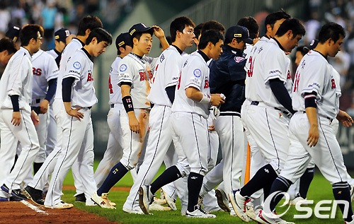 경기종료후 완봉패를 당한 두산 선수들이 고개를 숙인채 그라운드를 빠져나가고 있다. / soul1014@osen.co.kr
