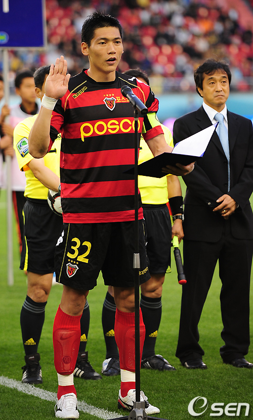 프로축구 승부 조작 사태로 분위기가 뒤숭숭한 가운데 28일 저녁 포항 스틸야드에서 열린 현대오일뱅크 K리그 2011 12R 포항 스틸러스와 대구 FC의 경기에 앞서 양 팀 선수단과 심판 및 관계자들이 그라운드에 도열한 가운데 포항 주장 김형일이 승부 조작 근절을 위해 대표로 선서하고 있다.
