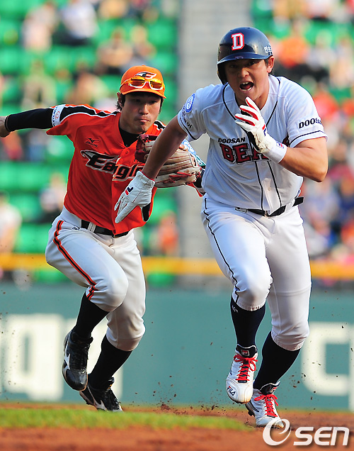 29일 오후 서울 잠실구장에서 열린 '2011 롯데카드 프로야구' 두산 베어스와 한화 이글스의 경기 2회말 무사 1,2루 두산 이원석의 타석때 1,2루 주자 이성열과 최준석이 이중도루를 시도했다. 1루 주자 이성열은 런다운에 걸려 협살되고 있다. 2루 주자 최준석은 3루에서 세이프됐다. / soul1014@osen.co.kr