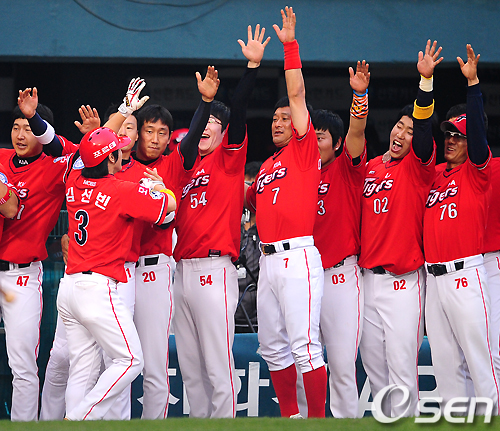 [OSEN=잠실,지형준기자] 2일 오후 잠실구장에서 열린 '2011 롯데카드 프로야구' LG 트윈스와 KIA 타이거즈의 경기, 3회초 1사 2,3루에서 KIA 김선빈이 선제 스리런 홈런을 날리고 덕아웃에서 동료선수들의 축하를 받고 있다. /jpnews@osen.co.kr