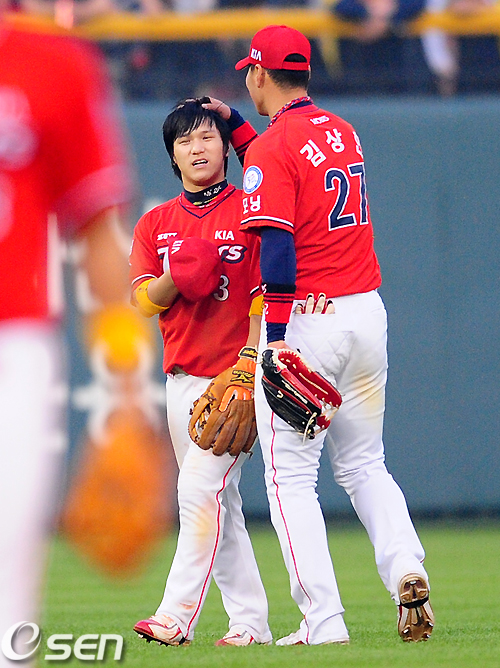 [OSEN=잠실,지형준기자] 2일 오후 잠실구장에서 열린 '2011 롯데카드 프로야구' LG 트윈스와 KIA 타이거즈의 경기, 3회말 1사 1,2루에서 KIA 김선빈이 LG 이병규의 타구를 놓치자 김상현이 모자를 건네주며 격려하고 있다. /jpnews@osen.co.kr