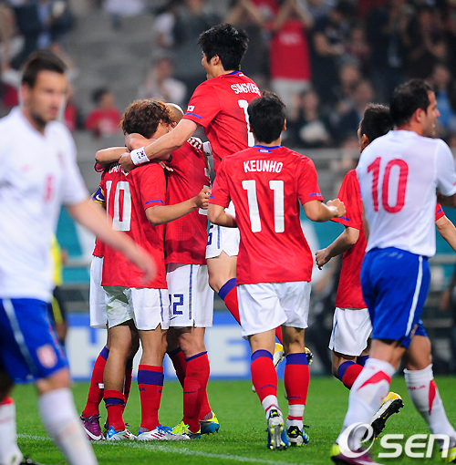 3일 오후 서울월드컵경기장에서 열린 대한민국과 세르비아의 평가전, 전반 한국 박주영이 선제 헤딩골을 성공시키고 동료선수들과 기뻐하고 있다.